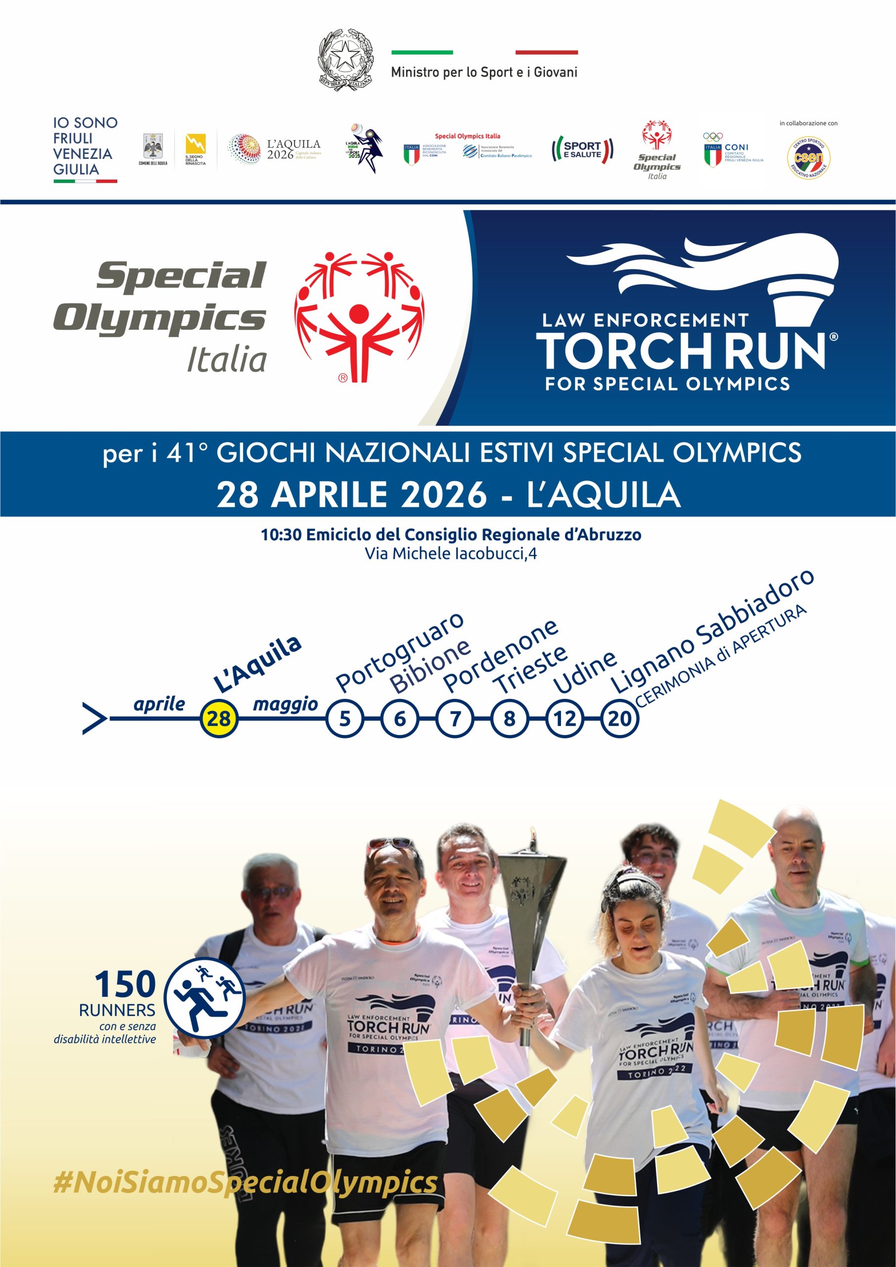 L’Aquila, 28 aprile 2026 – Ha preso ufficialmente il via questa mattina da L’Aquila la prima tappa del Torch Run, il viaggio della Fiamma che accenderà i 41° Giochi Nazionali Estivi Special Olympics, in programma dal 19 al 24 maggio tra Lignano Sabbiadoro, Portogruaro, Bibione e Cordovado.